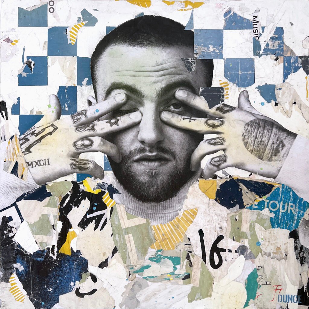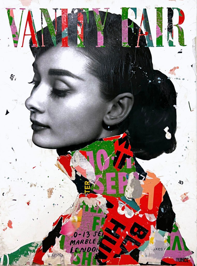 DUNCE emphasizes this point by utilizing the grittiness of torn up street posters he has reclaimed from city walls and billboards.