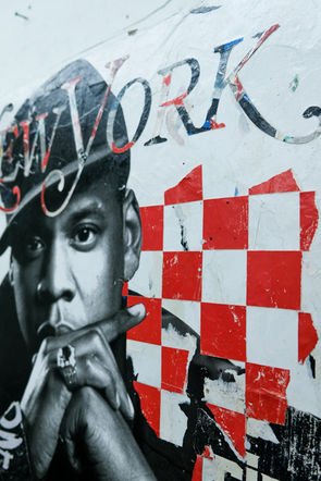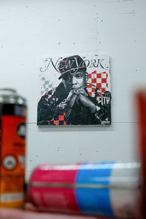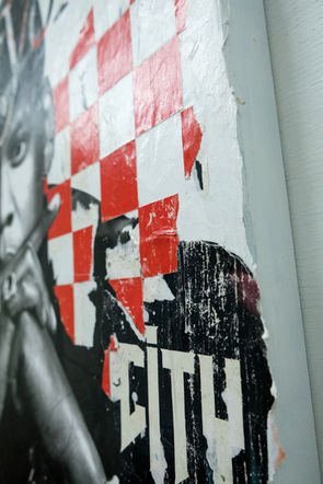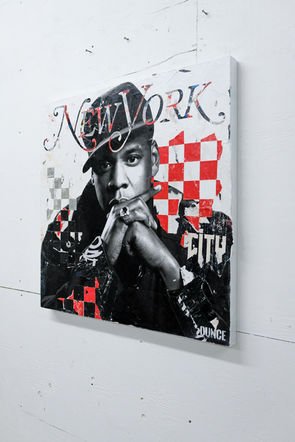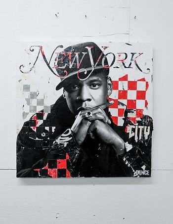Blending the visual language of street art with traditional fine art techniques ‘Fame and Fortune’ takes a critical look at pop culture. This series juxtaposes the glamour of celebrity with the realities of how icons are often viewed, consumed and exploited. Dunce emphasizes this point by utilizing the grittiness of torn up street posters he has reclaimed from city walls and billboards.