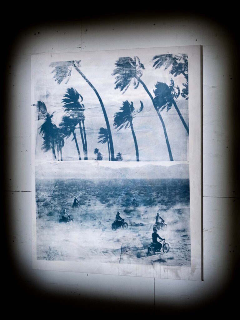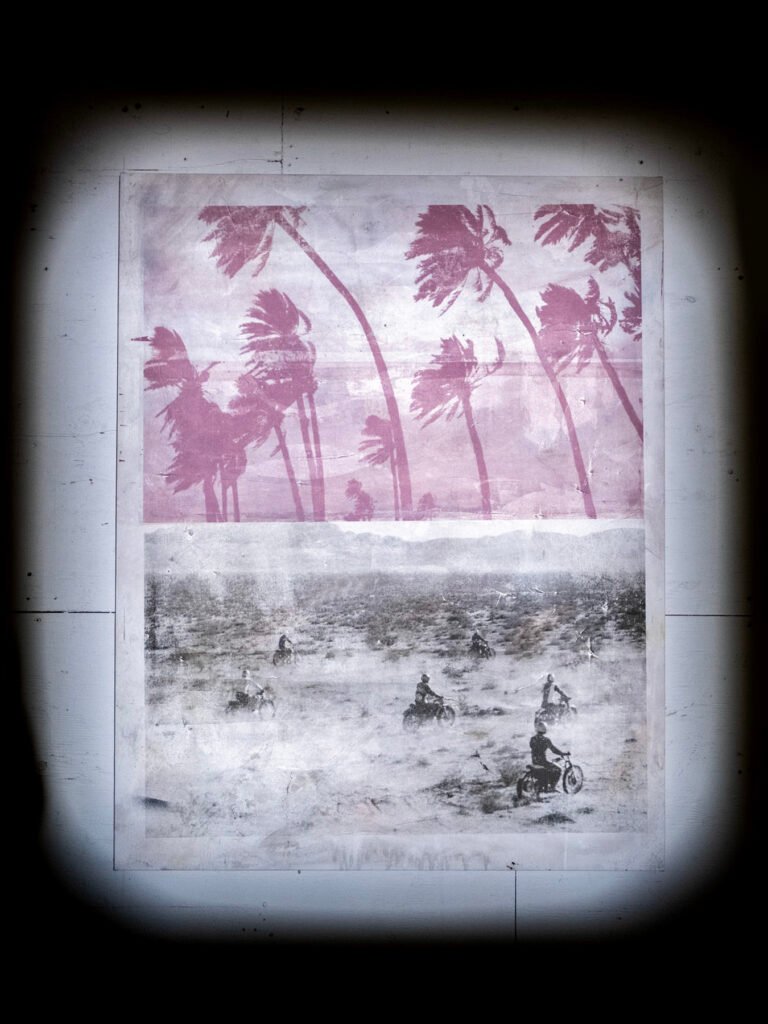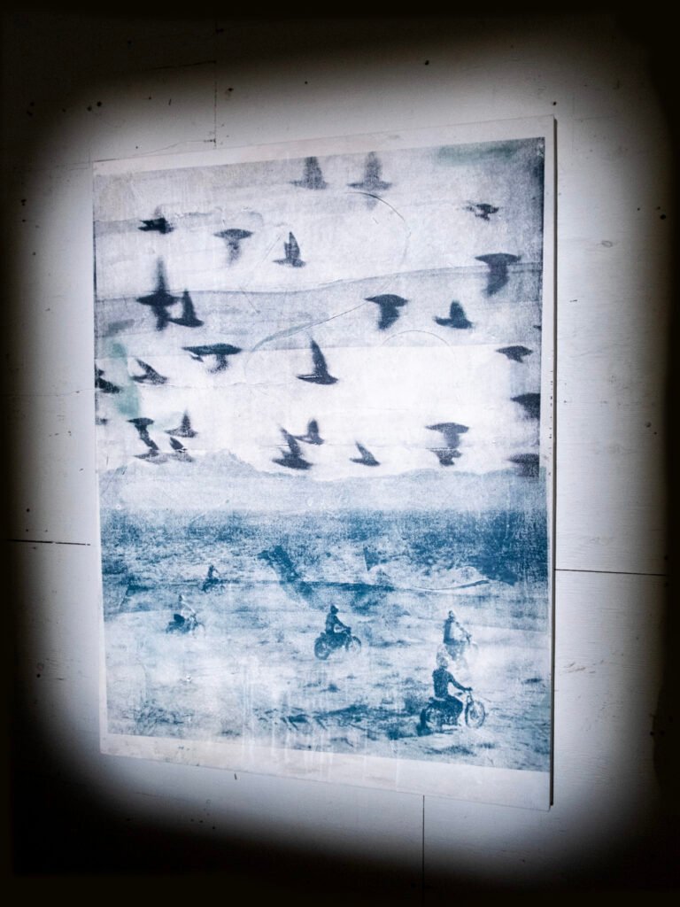 Dunce’s newest collection, Currents, is a search for that feeling of moving with, rather than against, the flow. The series is defined by Dunce’s approach to silkscreen as a painter rather than a printmaker. Ink drifts across rough canvas, textures emerge unpredictably, and images layer to evoke the push and pull of natural forces.